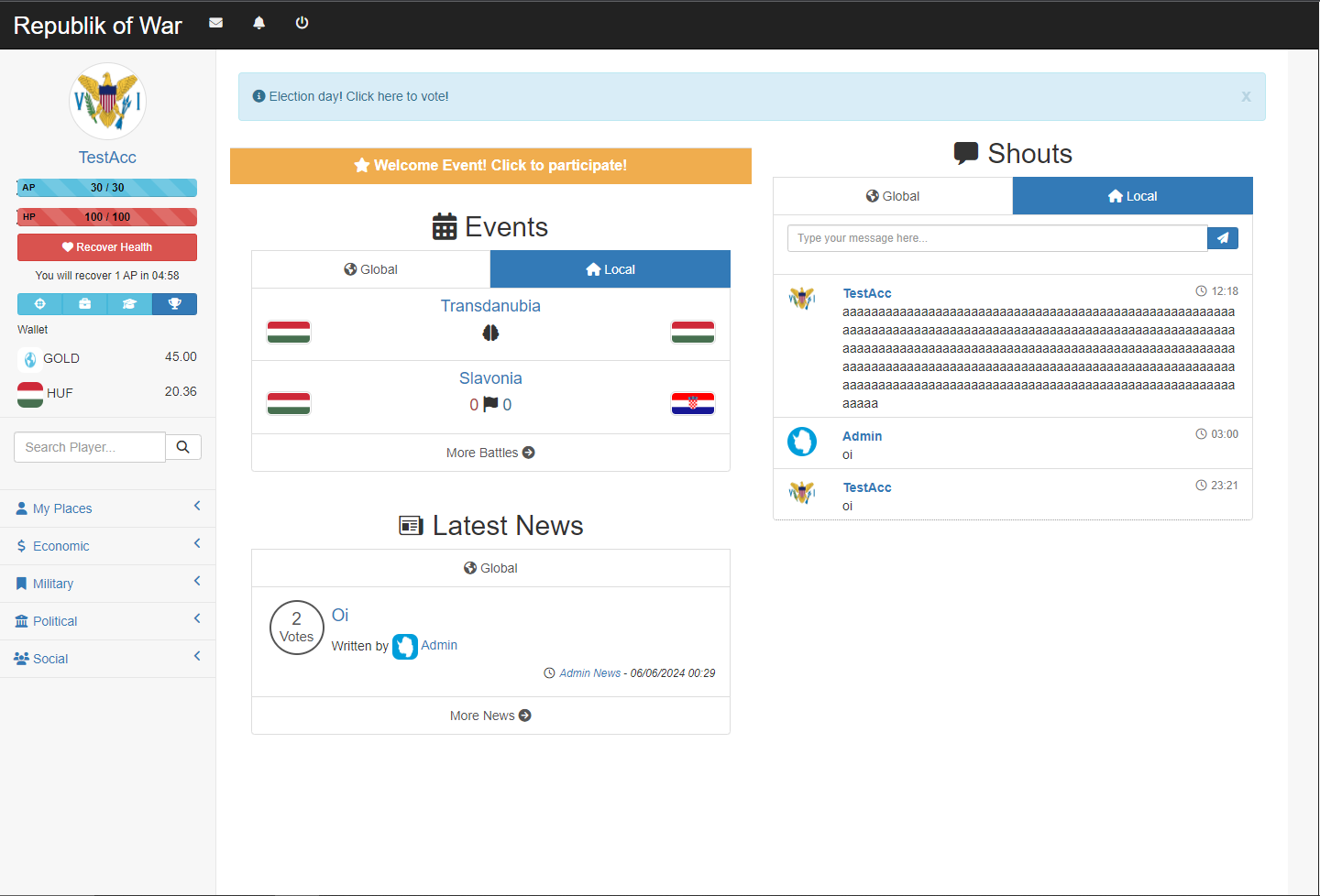 Main page of the game